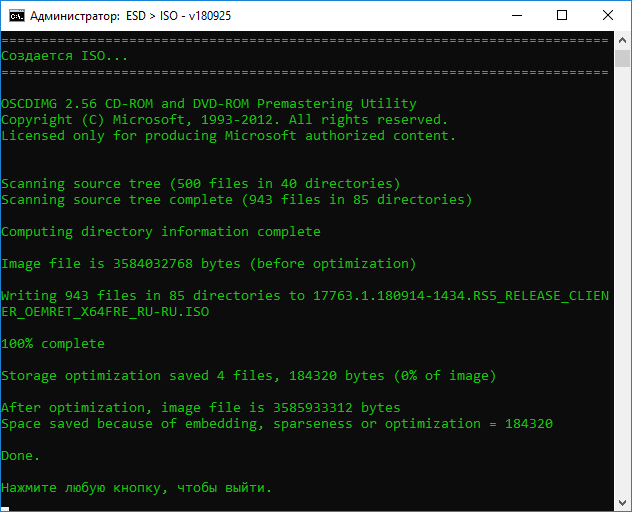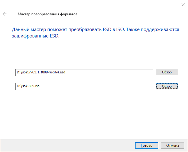 Указываем путь к файлу ESD и к будущему образу ISO. Нажимаем кнопку «Готово».