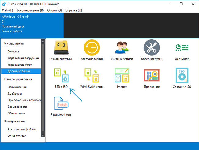 В главном меню Dism++ найдите раздел “Инструменты” и выберите пункт “Дополнительно”. В открывшемся подменю вы увидите опцию “ESD в ISO”. Также, эту функцию можно найти в меню “Файл”.